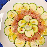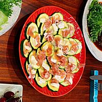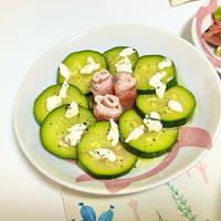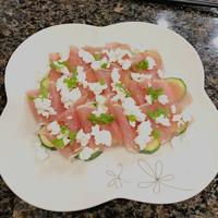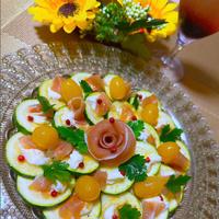 ズッキーニをカルパッチョにしました。生ハム、カッテージチーズと一緒に食べると更に美味しくなりますよ。レモンドレッシングでさっぱりと頂きます。見た目もきれいなので、おもてなしにもぴったりですよ。ぜひ一度お試し下さい。