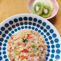 - 3 中火で熱したフライパンにごま油をひき、2を入れて炒め、色が変わったら溶き卵を加えてさっと炒め、ごはん、(A)を加えます。
