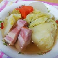 ベーコンと野菜の和風ポトフのご紹介です。ブロックベーコンのうま味と野菜のうま味がスープに溶け出しておいしいですよ。パンにもごはんにもよく合います。簡単にできますので、ぜひお試しくださいね。