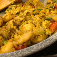 タイのプーパッポンカリーをエビに変えてアレンジしてみました。プリプリのエビがふわふわ卵に絡み、クセになる美味しさです。ラー油のピリッとした辛味が味を引き立てて、エスニックな風味がたまらない一品です。是非お試しください。