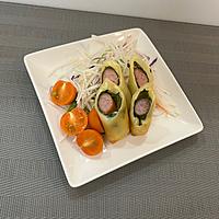 - 2 まな板の上にスライスチーズ、大葉、1をのせて端から巻きます。