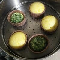 人参の代わりに、みんなかぼちゃとほうれん草で作ってみました。かぼちゃはすりおろし、ほうれん草は茹でた物を刻んでハンドミキサーで半ペースト状にしました。ホットケーキミックスを混ぜた所で二つに分け、かぼちゃとほうれん草を30gずつくらい混ぜました。ココットがなかったので、ちょっと硬めのカップ紙5つに分けて蒸しましたが、熱の伝わりが弱かったのか、蒸しあがるのに30分近くかかりました。