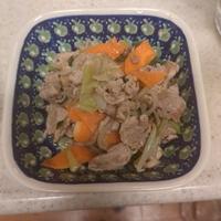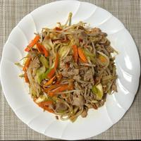 - 2 フライパンを熱し、豚肉、1、もやしを中火で炒めます。