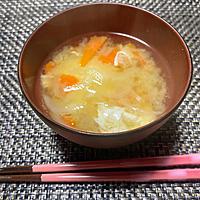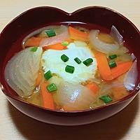 玉ねぎ、にんじん、小松菜、たまご。食べ応えあるお味噌汁。
