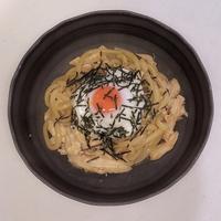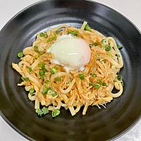 サラダチキンと温泉卵が絶妙にマッチした優しい味わいのうどんです。生姜の風味が効いた出汁に、ネギの香りが爽やかなアクセントを添えています。砂糖の甘みと醤油のコクが調和したコクのある出汁は、体調の優れない時にも食べやすく、心も体も温まります。サラダチキンの缶詰を使えば手軽に作れて、タンパク質もしっかり摂取できる栄養満点の一品です。