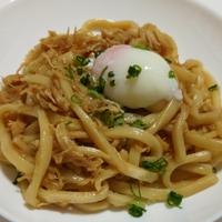 サラダチキンと温泉卵鶏うどんはいかがでしょうか。甘辛く味つけしたうどんに、温泉卵がよく絡んでおいしいですよ。冷凍うどんを使うので、短時間で手軽に作れます。ぜひお試しくださいね。