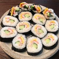 海苔は食べる直前に巻き、巻き簾でご飯のみ巻いて冷蔵庫で30分ほど冷し、食べる時に海苔を巻きました。海苔がパリパリ、ご飯は甘みもあり透き通っていて、見た目も綺麗でした。4本作り、すぐ完食です。