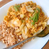 - 3 フライパンにサラダ油を中火で熱しキャベツを軽く炒めます。キャベツがしんなりしてきたら卵を入れて全体的の混ぜ合わせながら加熱します。