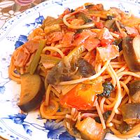 - 4 ナスがしんなりしてきたら中火のままトマトソースの材料を入れて加熱します。沸騰したらスパゲティを半分に折って入れ、パッケージの表記通りに加熱し、スパゲティがやわらかくなったら火から下ろします。