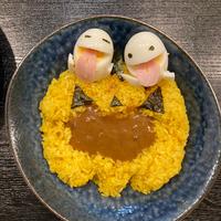 - 6 器に2をかぼちゃの形に盛り付け、口の部分のごはんを取り除きます。口の部分に5を流しこみ、 4の実の部分をのせます。