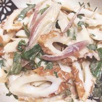 香味野菜がおいしい、ちくわの和え物はいかがでしょうか。香味野菜のシャキシャキとした食感と、ちくわの旨味がよく合う一品です。程よい酸味と旨味のある梅昆布茶を使うと、簡単に味が調いますよ。お酒のおつまみにぴったりなので、ぜひお試しくださいね。