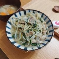 - 3 中火に熱したフライパンにごま油をひき、2を入れて炒め、豚バラ肉に火が通ったら1、もやしを加えます。