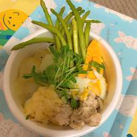 アスパラ、蒸し鶏、チーズとじゃがいもも、トッピングして、彩り良く仕上げました。たんぱく質も摂取出来て、ヘルシーです! #PR #日本即席食品工業協会