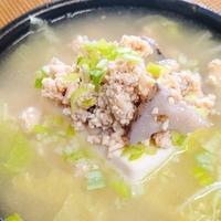 豆腐は冷蔵庫から出しておきます。鶏挽肉と生姜とにんにくとれんこんを味噌ラーメンスープの素1/3量とみりん、醤油で味付けし電子レンジ加熱して肉味噌にします。カップラーメンにお湯を注ぎラーメンの出来上がりを待つ間に白菜を電子レンジ加熱し、出来上がったラーメンに白菜、豆腐1パック、肉味噌、刻み葱をトッピングしました。