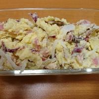 かぼちゃがあまりにもおいしかったので、今回さつまいもで。前回同様レーズンとレンチン1分のベーコンを加えて。これまためちゃ美味しいサラダができました。いもは600w3分でよかったです。