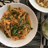 - 2 耐熱ボウルにもやし、1を入れラップをし600Wの電子レンジで2分程もやしがしんなりするまで加熱します。