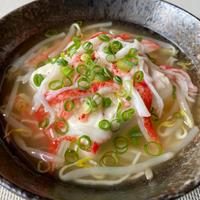 - 3 2にカニカマを割いて入れ、ラップをし、600Wの電子レンジで4分熱します。