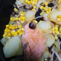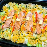 - 7 5に4を戻し、6を全体にかけ、アルミホイルで蓋をして、蒸し焼きにします。鮭の中まで火が通ったら、コーンと有塩バターをのせ、完成です。
