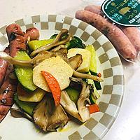 地元産の行者にんにく入りポークウインナーをソテー。具材はあったものを使用。舞茸、長芋、きゅうり、人参。塩コショウ少々で味付け。色合いもよく食欲をそそります。