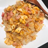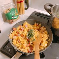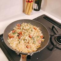 - 5 ニンニクの香りがしてきたら1と2を加えてよく炒め、ごはんを加えて切るように炒めます。
