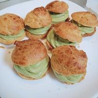 少し小さめのシュークリームに、抹茶味のカスタードクリームを絞りました。やさしい甘さでコクのあるカスタードクリームに、抹茶のほろ苦さが加わりとてもおいしいですよ。小さめなので、パーティーの一品にいかがでしょうか。