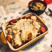 ストックしておいたごはんと残りカレー、ウインナー、卵を使って、焼きカレーを作りました。チーズとパン粉の香ばしさと、とろっとした半熟卵がカレーの辛さを和らげてくれます。簡単ですし、ひとりごはんにピッタリですよ。