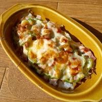 - 6 1、2、3をのせ、ピザソース、ピザ用チーズをかけたらオーブントースターでチーズに焼き色が付くまで10分ほど焼いたらできあがりです。