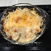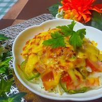 - 5 耐熱皿にごはんを入れ、4をのせ広げます。