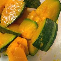 - 1 かぼちゃは皮を所々むき、一口大に切ります。 かぼちゃの切り方はこちらを参考にしてくださいね。