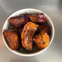黒ごまはお好みの量調節して下さい。 さつまいもの量を増やす場合は、調味料も倍量使用して下さい。 タレを煮詰めるととろみがつきます。 さつまいもをお皿に盛り付けた後かけて食べても美味しいです! さつまいもは大体5cm幅の乱切りにしています。