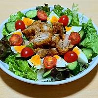 こんがりと焼いた鶏のソテーをサラダに混ぜ合わせました。食べ応えもあり、朝食や、間食にもぴったりですよ。パンに挟んでサンドイッチにしてもおすすめです。豪華でおいしいですので、ぜひ一度作ってみてくださいね。