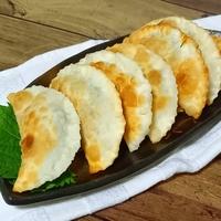 - 3 餃子の皮に1を塗り、2を乗せたら、半分に折り、端を水で止めます。