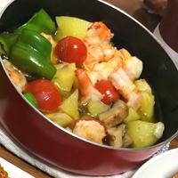 家にあったものなので具材はほとんど違いますが...エビ、トマト、じゃがいも、しいたけ、シシトウで!美味しかったです。オリーブオイルもにんにくがきいててバゲットにピッタリ!