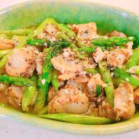 ホタテとアサリが冷凍の保存であったので時短で お客様の お酒のおつまみに作りました。アスパラがいい感じで魚介のアクセントになってます。