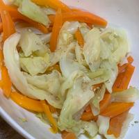 - 準備 キャベツは芯を切り落としておきます。にんじんはヘタを取り、皮を剥いておきます。