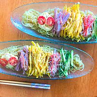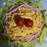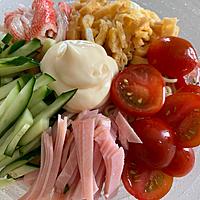 - 4 2を千切りにします。ロースハムは千切りにします。カニカマは手でほぐします。