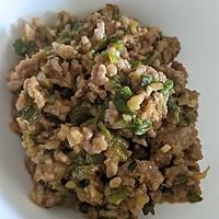 - 4 ひき肉の色が変わったら1を加えて炒め、長ねぎの青い部分がしんなりしたら一度火を消し、(A)を加えて混ぜます。