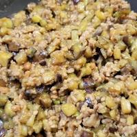 - 4 (A)を加えて中火で炒め合わせ、豚ひき肉に火が通り全体に味がなじんだら火から下します。