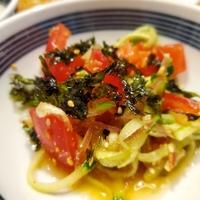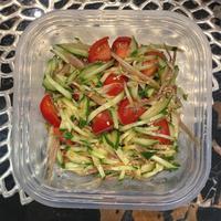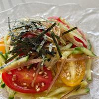 キュウリは千切りではなくスライサーでミニトマトの代わりにトマトを1/2個。ミョウガが効いててさっぱり美味しかったです。韓国海苔を上に散らして皿にゴマ風味アップ。