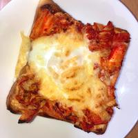 朝ごはんに作りました。キムチの小分けを使いました。チーズに焼き色がつかなかったので18分トースターで焼きました。卵が少し固くなってしまいい半熟にはならなかったけど次作る時はレシピ通りに作ろうと思います。