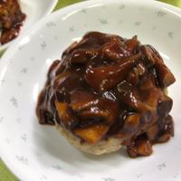 - 8 しめじに火が通ったらデミソースの材料を入れ1分ほど中火で炒め合わせ火から下ろします。