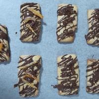 - 5 4をビターチョコレートに半分くぐらせ、冷蔵庫で10分程冷やし固めます。