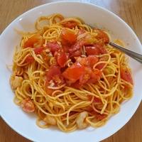 エビの臭みが気になる方は片栗粉をまぶしてから洗うようにして下さい。 トマトはトマト缶で代用可能です。 茹で時間はパッケージに記載されている時間を目安にして下さい。 塩加減、辛さはお好みで調整して下さい。