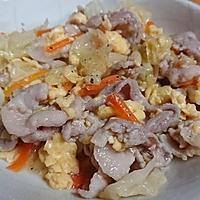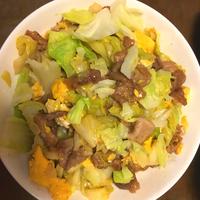卵2個、お肉200g。ちょっと味濃いめになってしまったので味つけをしないでレンチンしたキャベツを足しました。