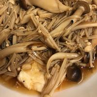 - 6 えのき茸としいたけをフライパンに入れて炒め、(A)を加えてひと煮立ちさせたら、水溶き片栗粉でとろみをつけ、豆腐にかけたら完成です