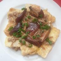 少し残った豆腐をボリュームのあるメニューに変身させました。えのき茸やしいたけと組み合わせて、とってもおいしいメニューです。隠し味として、すりおろしニンニクを豆腐の表面に塗りました。おかずにもお酒にも合いますし、ごはんにかけて丼にしても美味しいですよ。