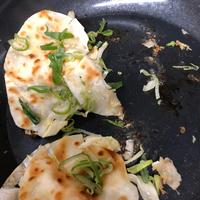 - 4 1を乗せ、残りの餃子の皮を3と同じように並べて上から軽くおさえ、中火で焼きます。