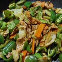 ピーマンは5個、豚バラは豚コマで代用、胡麻油で生姜と豆板醤を香り付けしてから、豚肉をいれる方法を覚えたいです