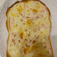 - 3 食パンにマヨネーズをぬり、薄切りハーフベーコン、ピザ用チーズ、2をのせ、オーブントースターで7分ほど焼き色がつくまで焼きます。