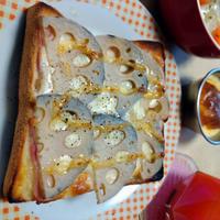 しゃきしゃきレンコンがたまらなく美味しい!レンコンチーズトーストです。ベーコンの塩気とチーズのアクセントが、あと引く美味しさに仕上がっています。朝食にもおつまみにもなる一品ですよ。是非、お試し下さい。